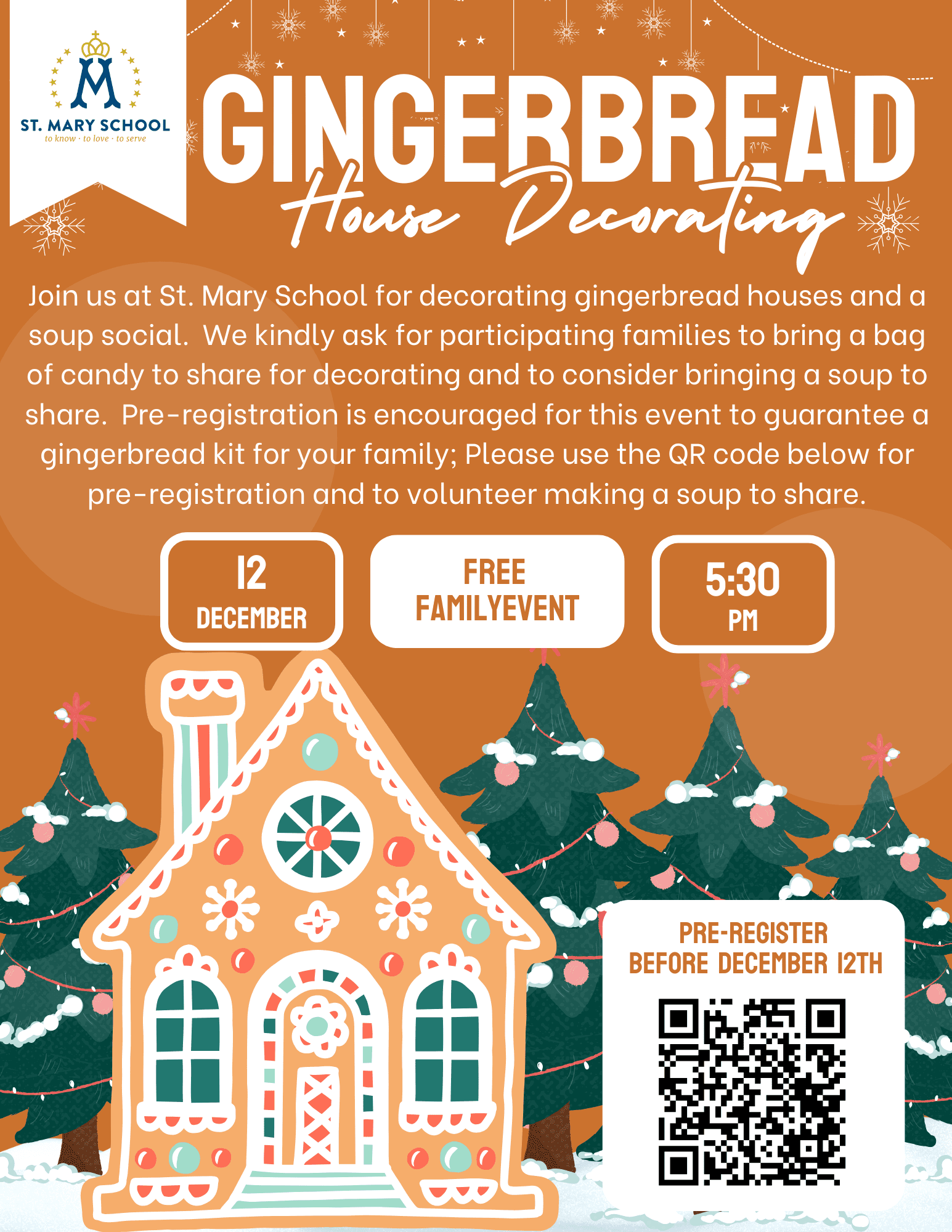 St. Mary Parish and SMS Families - Extended Deadline! Please pre register and join us on the 12th for this free family event: https://www.osvhub.com/stmarycharle.../forms/gingerbread2025