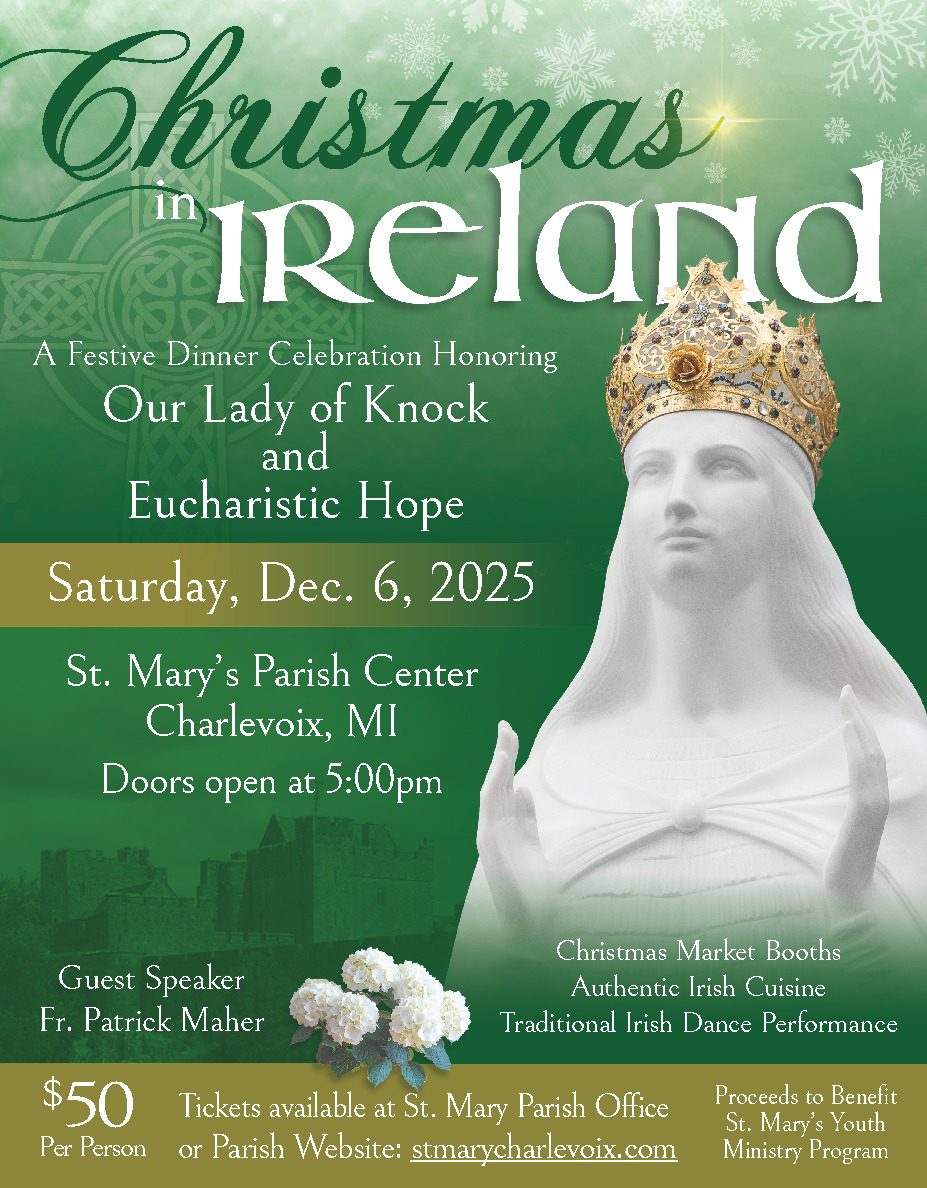 St. Mary Parish is hosting Christmas in Ireland on Saturday, Dec 6th. Don’t miss out on the fun and reserve your seat today! Please call the Parish Office at (231)…