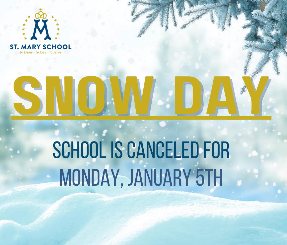 Due to the amount of snow accumulated, school is canceled for Monday, January 5th.