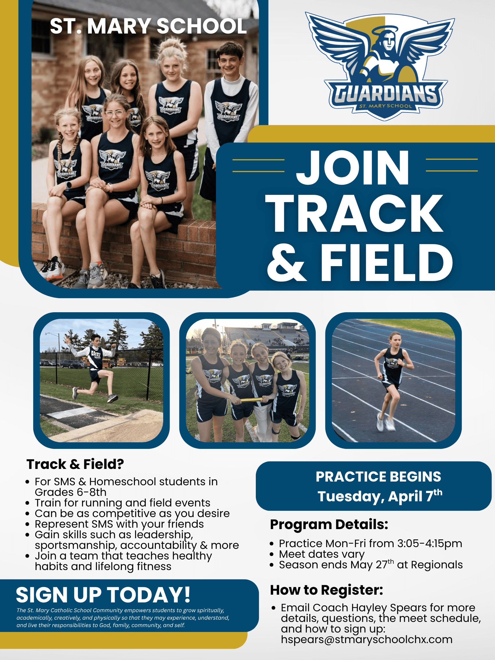 Track & Field for grades 6-8th begins Tuesday, April 7th. Our program is for SMS and Homeschool students! Contact Coach Spears for more information.