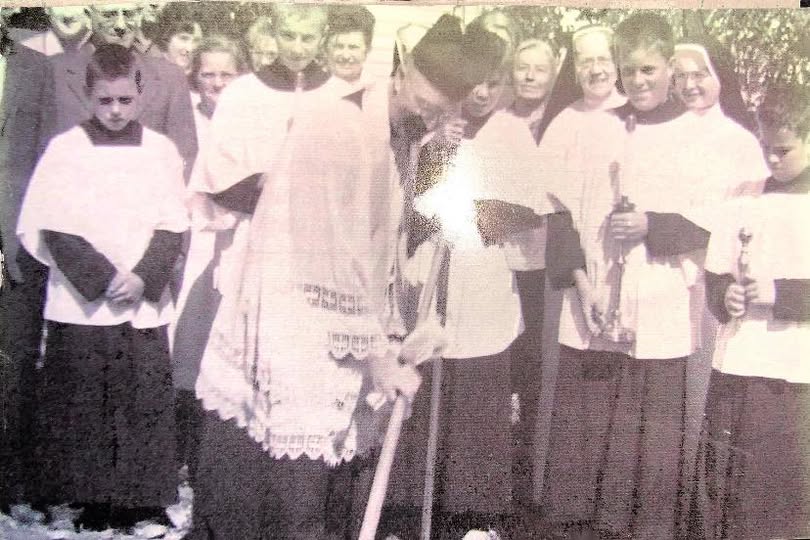 In 1953, Father E. Francis Denary arrived as pastor of St. Mary’s and immediately initiated a campaign to raise $75,000 to build a new school. The floor plan featured four classrooms, a parish meeting hall with complete kitchen, offices, lockers, restrooms, a utility room and a library. June 5, 1955 was the last day classes were held in the old school. Everything movable was stored and the old building was razed to make way for new construction. Ground was broken that year for the new school with Sister Athenasius, O.P. presiding as principal. The school could not be finished in time for classes in the fall so when classes began in September 1955, the first graders went to the public school and the 82 other students reported for classes at the old Lincoln School, now the Leslie T. Shapton American Legion Post.
