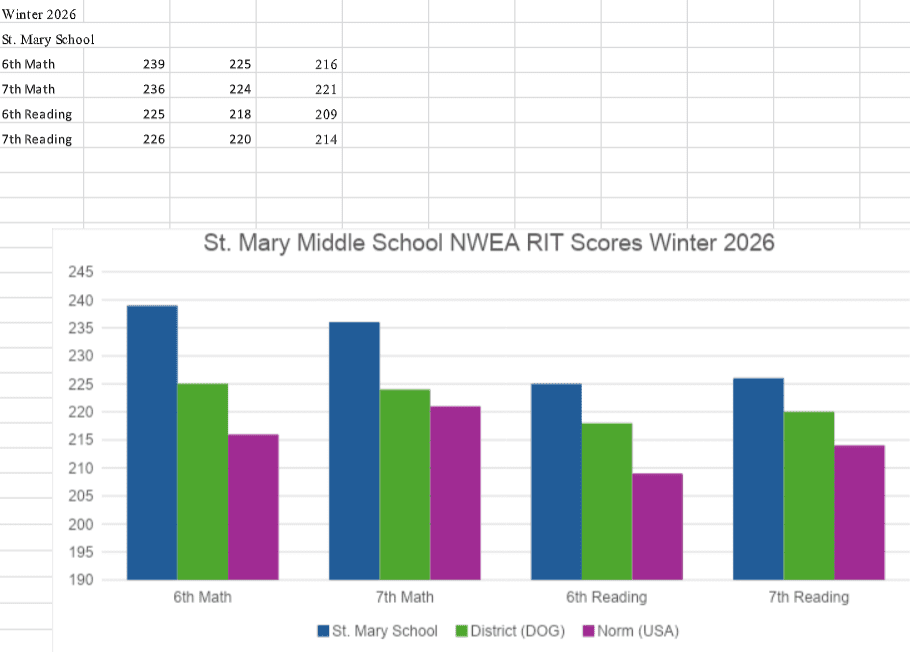 The St. Mary Catholic School Community empowers students to grow spiritually, academically, creatively, and physically so that they may experience, understand, and live their responsibilities to God, family, community, and self.