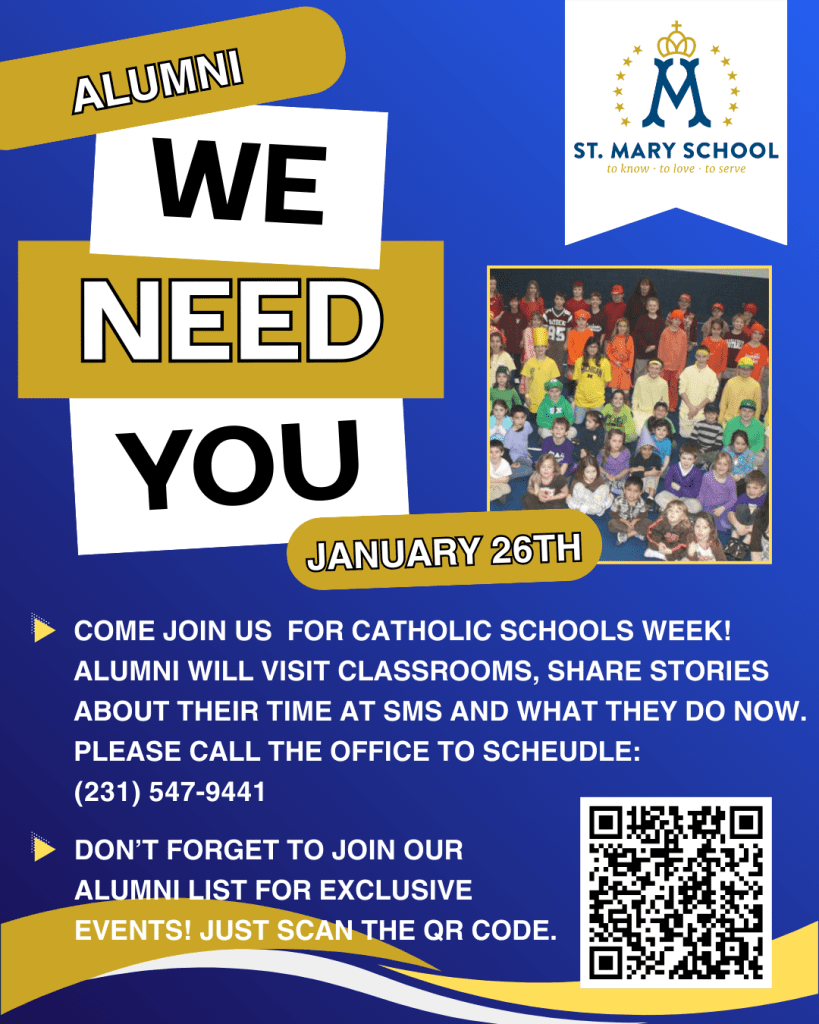 Alumni, come join us during the best week of the school year – Catholic Schools Week! We are looking for alumni to come visit classrooms on Monday, January 26th. Visitors will share stories from then they were a student at SMS and what they do now. Please call the main school to schedule your visit: (231) 547-9441