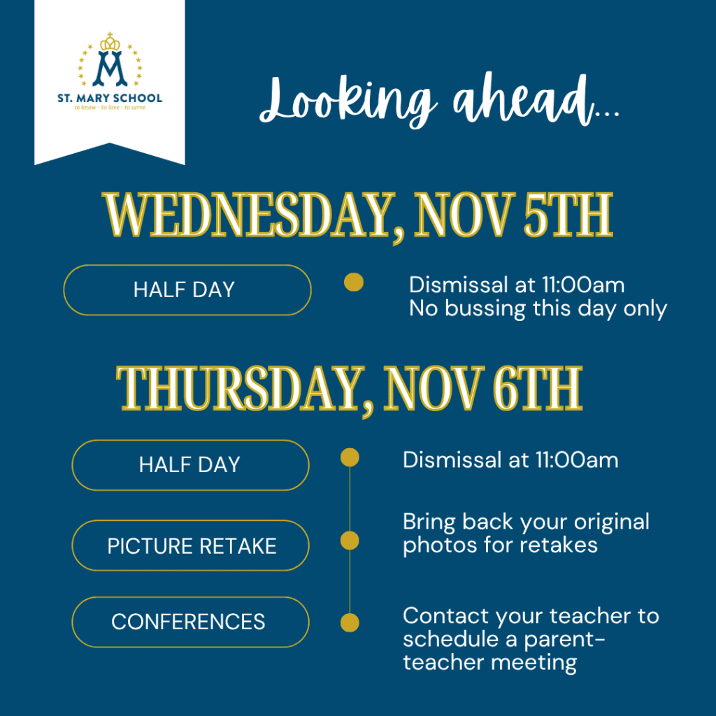 Thursday, November 6th is a half day of school. Dismissal will be at 11:00am for all students. We will also have Picture Retakes in the morning (please bring in your original photos) and Parent-Teacher Conferences will be in the afternoon/evening. Please contact your student’s teacher for your time slot.