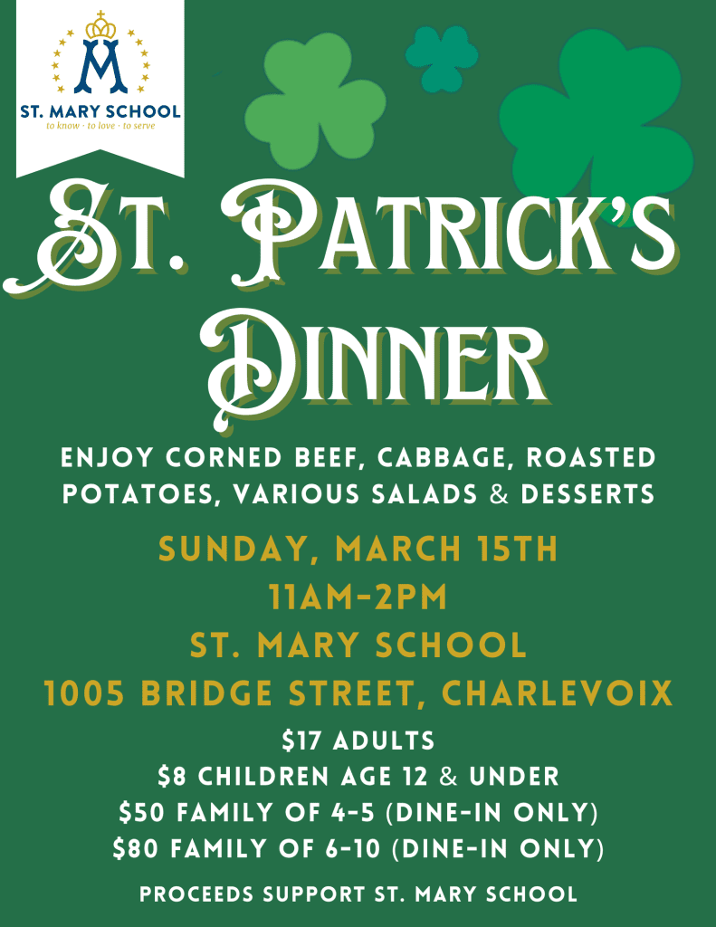 Celebrate at our annual St. Patrick Dinner on Sunday, March 15th! Dinner is dine-in or take-out from 11:00-2:00pm at St. Mary School. You will enjoy corned beef, cabbage, roasted potatoes, various salads & desserts. All proceeds support our school. We hope to see you there!